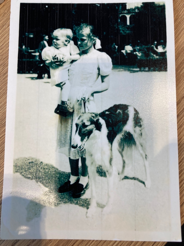 (Fot0-Rechte Bild-Archiv Erich Süßner, Bad König): Das Foto zeigt eine junge Dame- ein kleines Mädchen im rechten Arm und einen von Peter Berles berühmten „Kur-Windhunden“ an der Leine mit der linken Hand haltend- vermutlich an einem sonnigen Sonntagmorgen im Kurpark von Bad König neben der damaligen Wandelhalle. Es ist zu vermuten, dass es die anfänglichen 1950er Jahre gewesen sind.